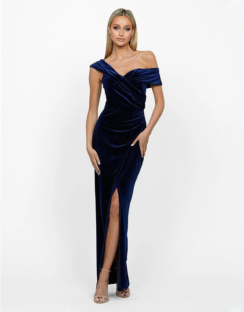 The Gabby oozes sophistication and posĂ© in a luxe smooth velvet finish. With its asymmetric neckline and ruched waist detail, this looks fabulous paired with a soft up-do to show off your dĂ©colletage.Â