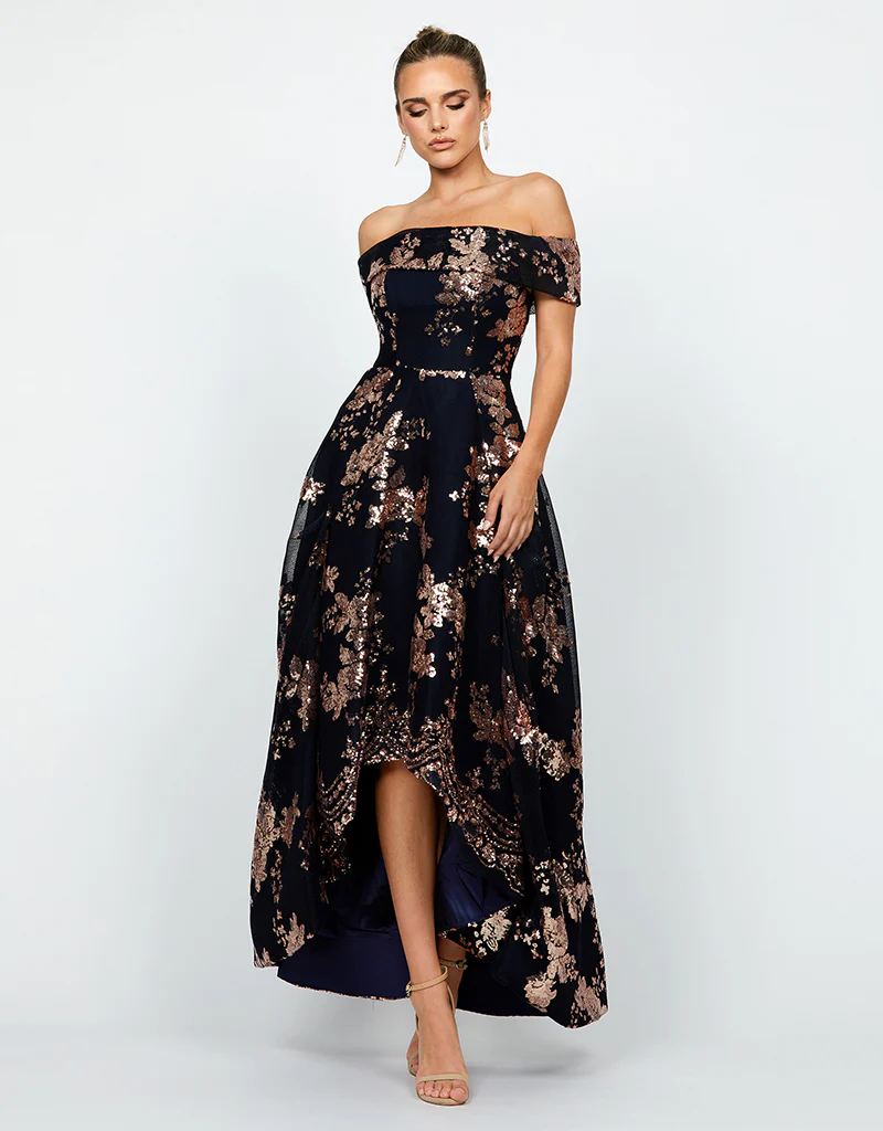 Our best-selling off-shoulder gown is a true showstopper, designed to turn heads with its elegant folded neckline and dramatic high-low skirt. The gathered skirt creates a flowing silhouette, while the fitted bust ensures a flattering shape. Lined for comfort and featuring built-in bust cups for support, this gown offers both style and structure. A concealed zipper at the back allows for a seamless finish, making it perfect for any formal occasion.Â