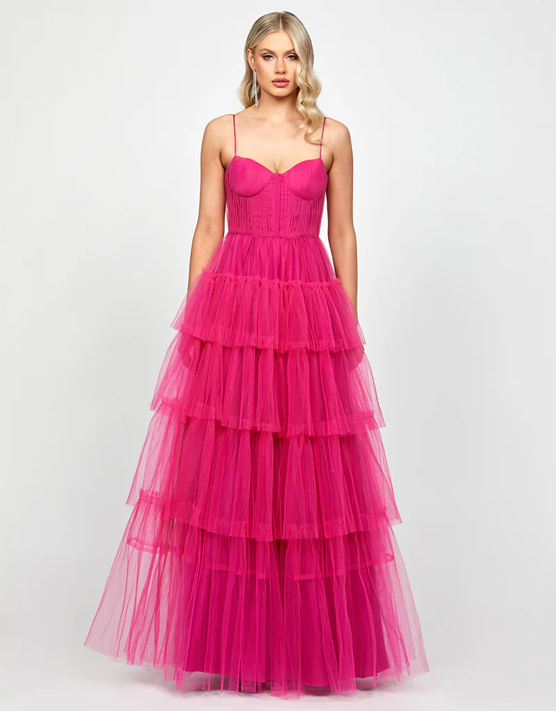 The full-length, multi-tiered A-line skirt is the star of this dress, with its beautiful layers that create a flowing, graceful effect. The stiff mesh interlining adds volume and structure to the skirt, giving it an enchanting, floaty feel with every movement. The invisible back zip closure ensures a seamless finish, while the full lining offers comfort and support for all-day wear.