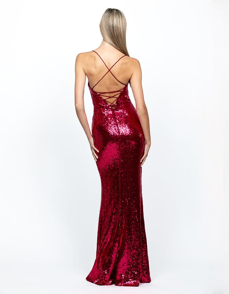 A slim fit bias cut sequin gown, on-trend cowl neckline and a tie-up back for a perfect fit.